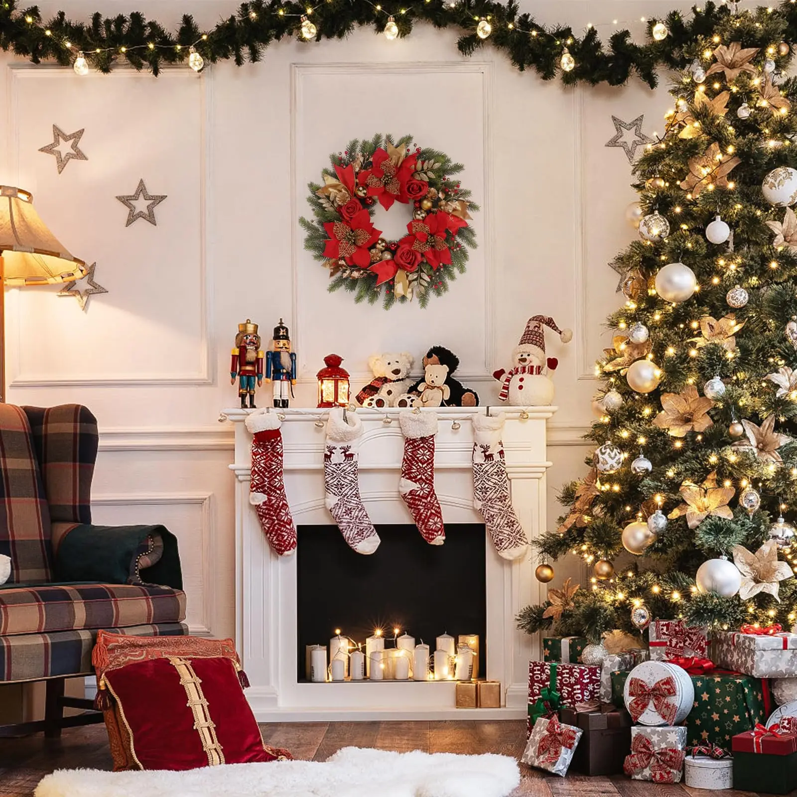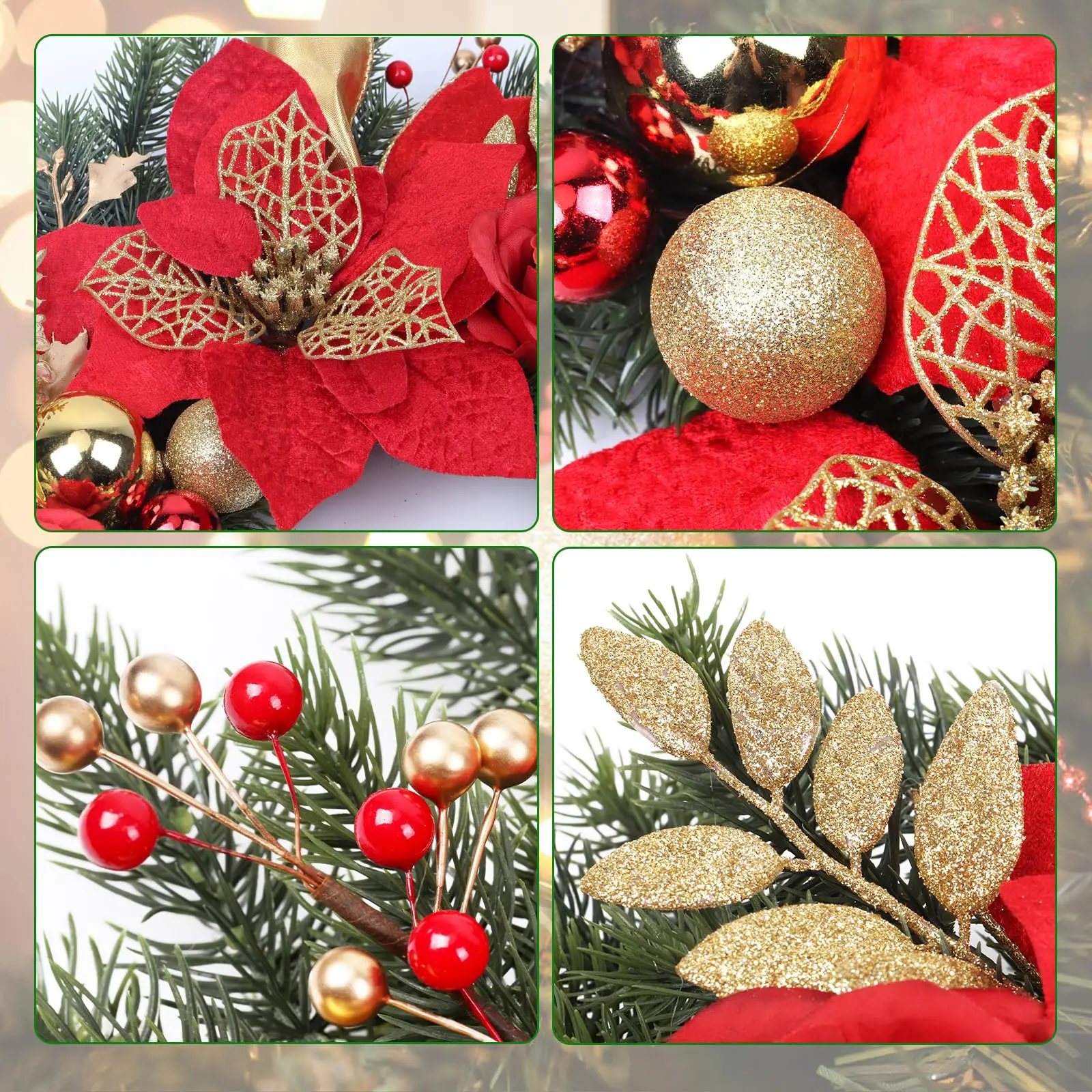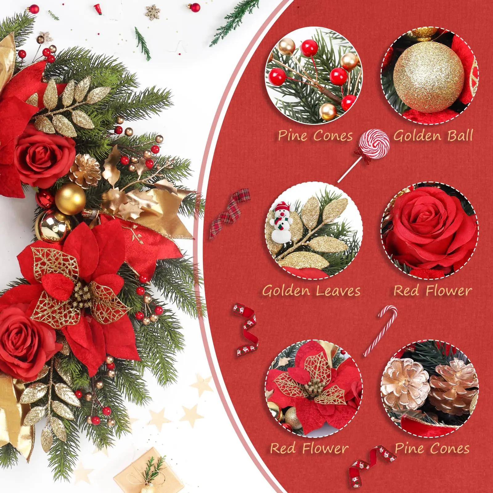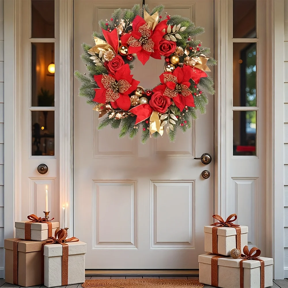 1 x 20" Holiday Christmas Wreath with Red Roses Gold Balls and Pinecones