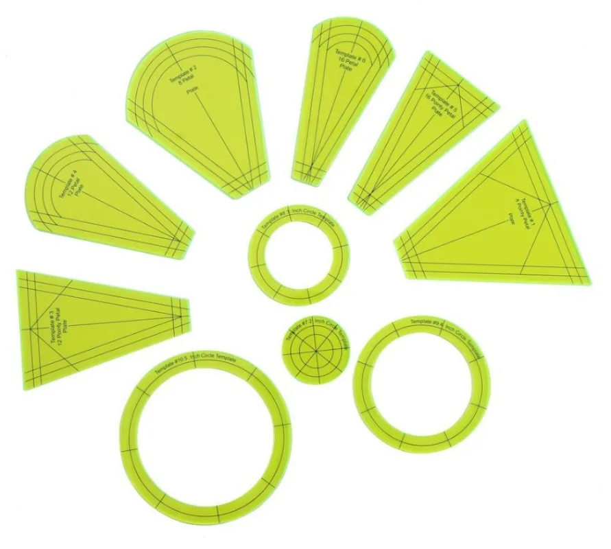 This is a versatile set of ten templates that can be mixed to create dozens of quilt blocks, cut tumbler, and circle shapes, and for free-motion machine quilting with a ruler.