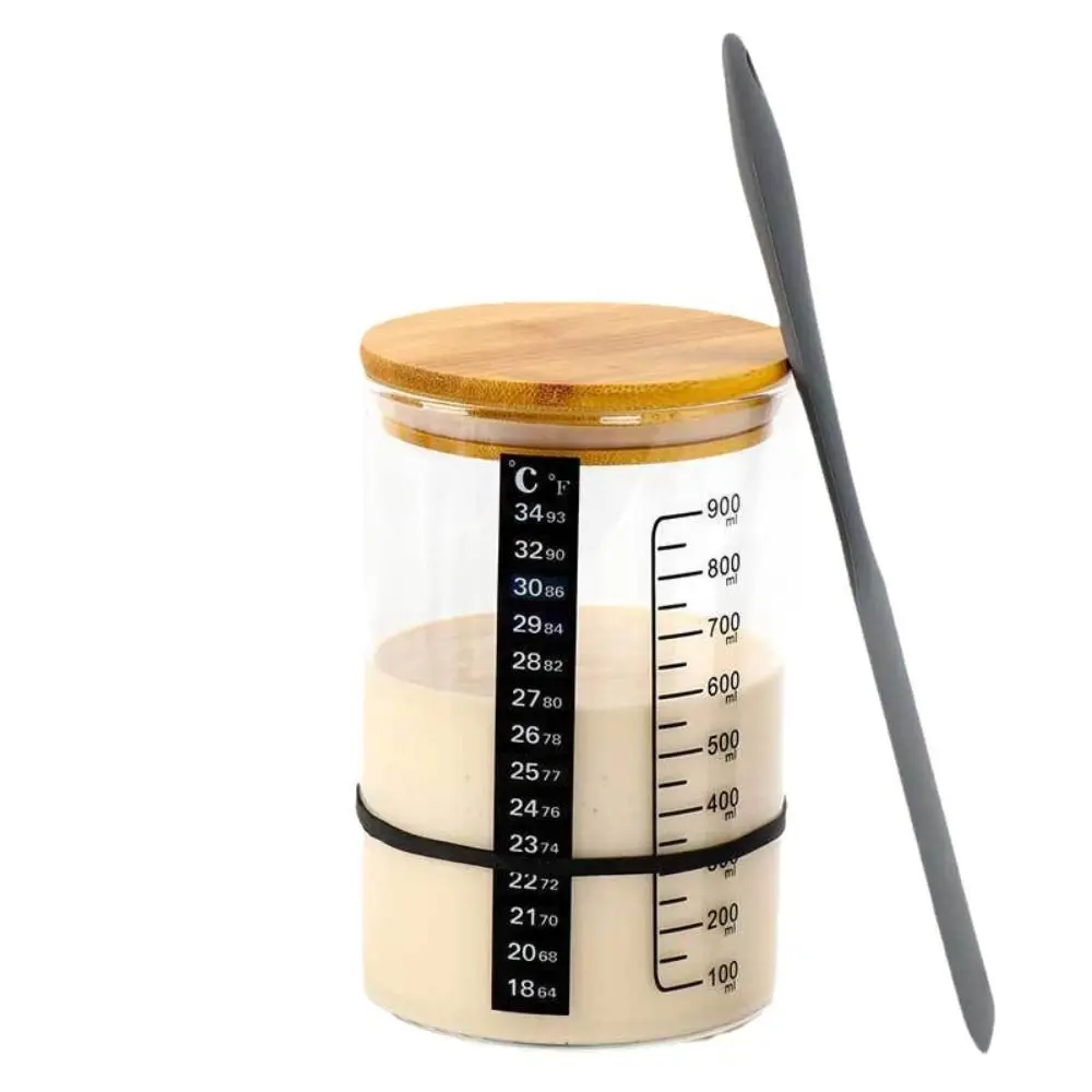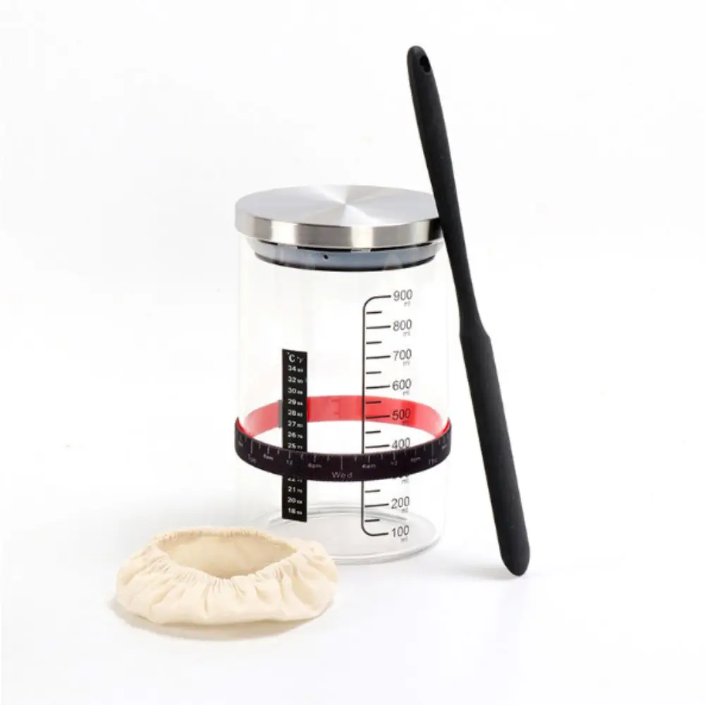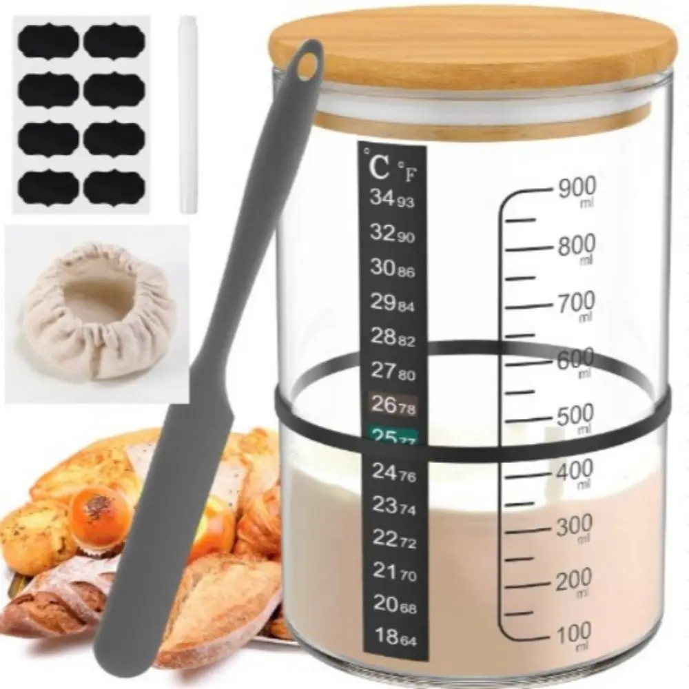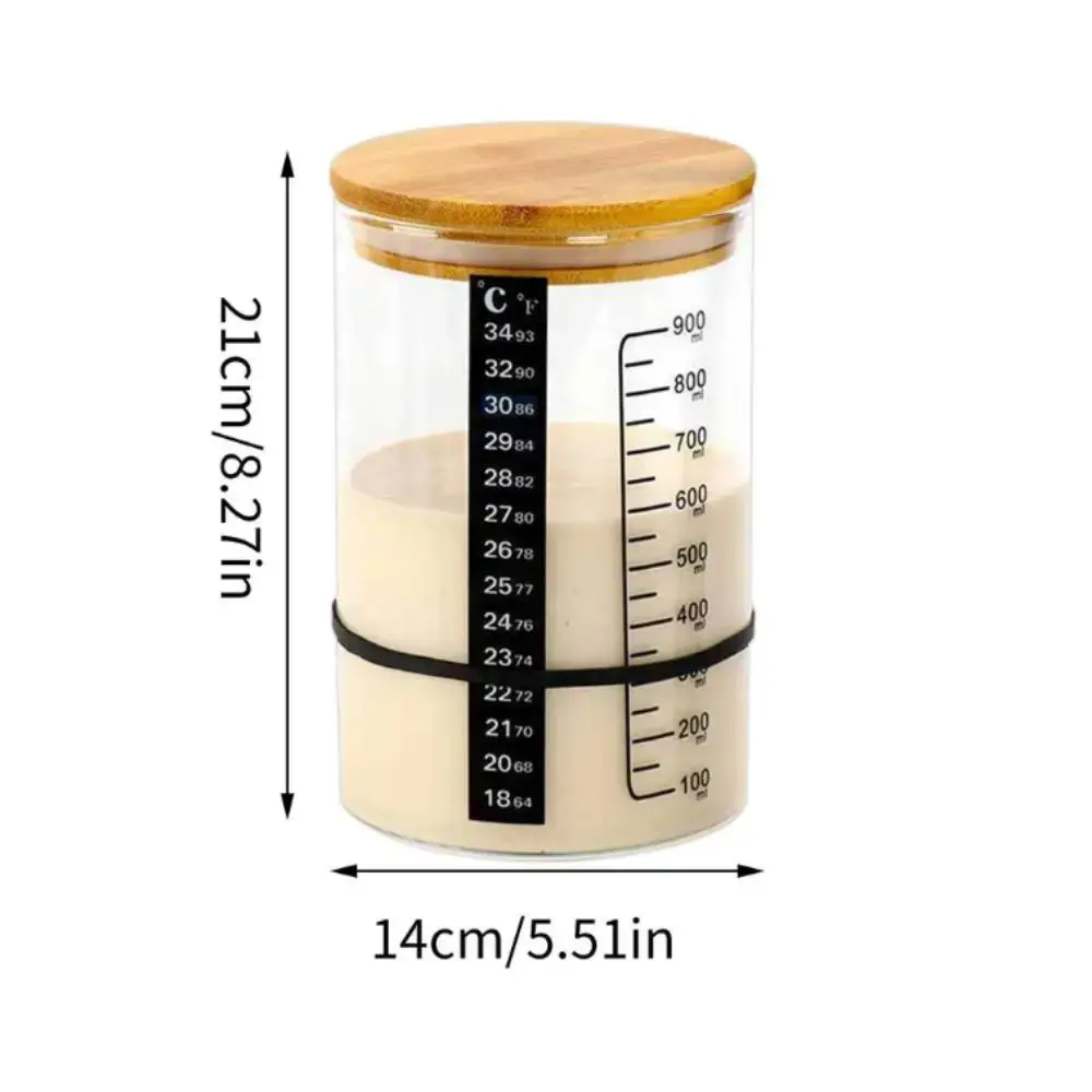 4.Quality Material and Reusable: This sourdough fermentation jar kit is made of high quality glass, wood, cotton linen, silicone, paper and other materials, reusable and long-lasting. The glass jar has a maximum capacity of 900ml, and measures about 10x15cm(3.94x5.91in).
