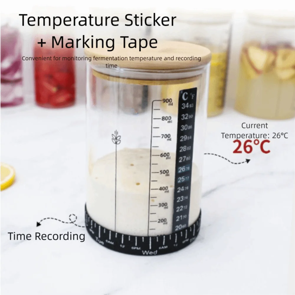 1.Multi-Purpose Marking Tape and Thermometer Paper: The 9pcs of sourdough starter jar kit includes multi-purpose marking tape and thermometer paper. The marker tape can mark and locate the fermentation time, the thermometer paper can read the temperature of the fermented dough at any time.