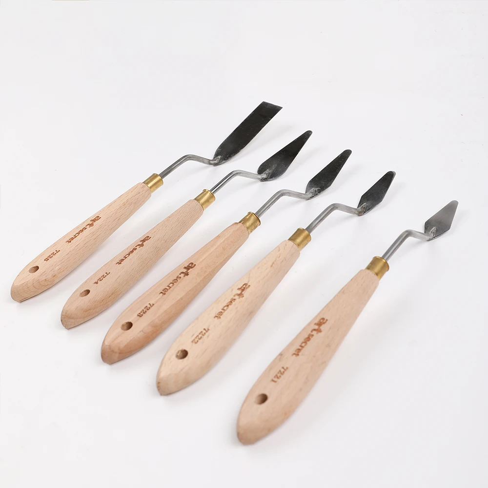 Material: 5 Piece painting knifes Set has been crafted with the finest stainless blade that resists all wear and corrosion from any media including acrylics. The painting tool provides a smooth surface for mixing and applying paint, allowing artists to achieve precise and clean painting. Wood handle is firmly fixed to the stainless blade, comfortable to hold and easy to use.