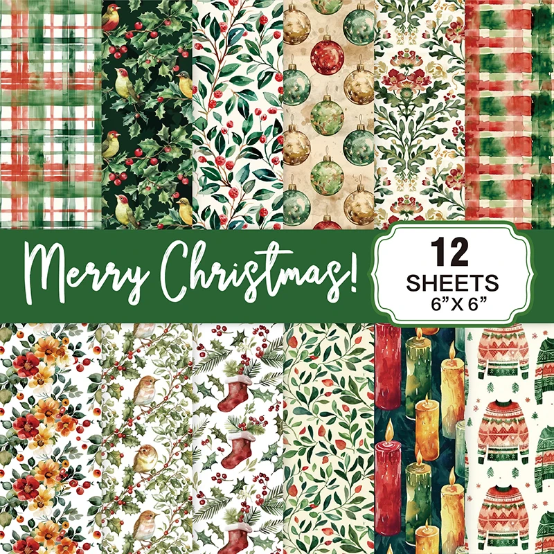 1. 12 Festive Single-Sided Designs: Each pack includes 12 unique, vibrant Christmas patterns—featuring snowflakes, knitted textures, berries, and more—printed on one side with a blank reverse for versatile crafting.