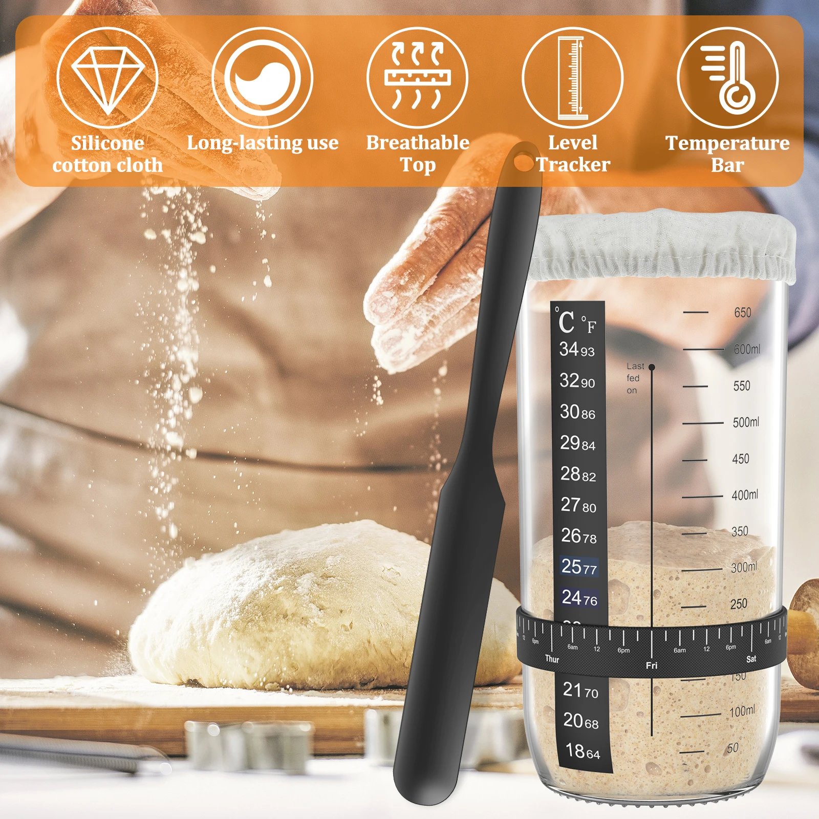 [Suitable for Beginners] This sourdough starter accessories kit is easy to use and perfect for beginners. It can make your process easier, especially with a silicone spatula that helps you mix and stir the fermenter fully.