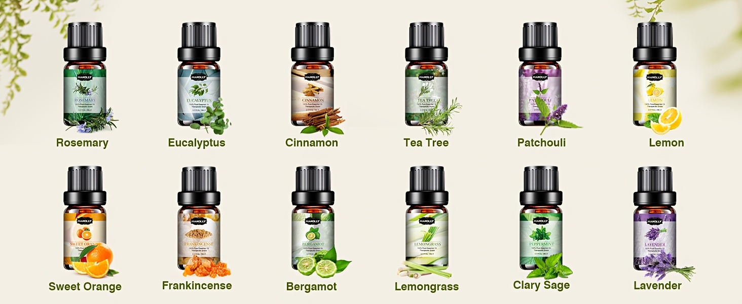 This collection features some of the most sought-after essential oils, including Tea Tree, Lavender, Sweet Orange, Eucalyptus, Lemongrass, Peppermint, Lemon, Bergamot, Frankincense, Rosemary, Patchouli, and Cinnamon Oil.