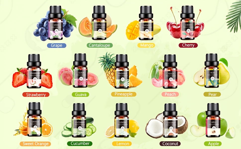 A collection of 14 must-have essential oils, featuring flavors like strawberry, cherry, pineapple, guava, apple, grape, coconut, mango, peach, pear, cucumber, cantaloupe, sweet orange, and lemon. This fruity essential oils set is perfect for diffuser aromatherapy, candle crafting, and beyond.