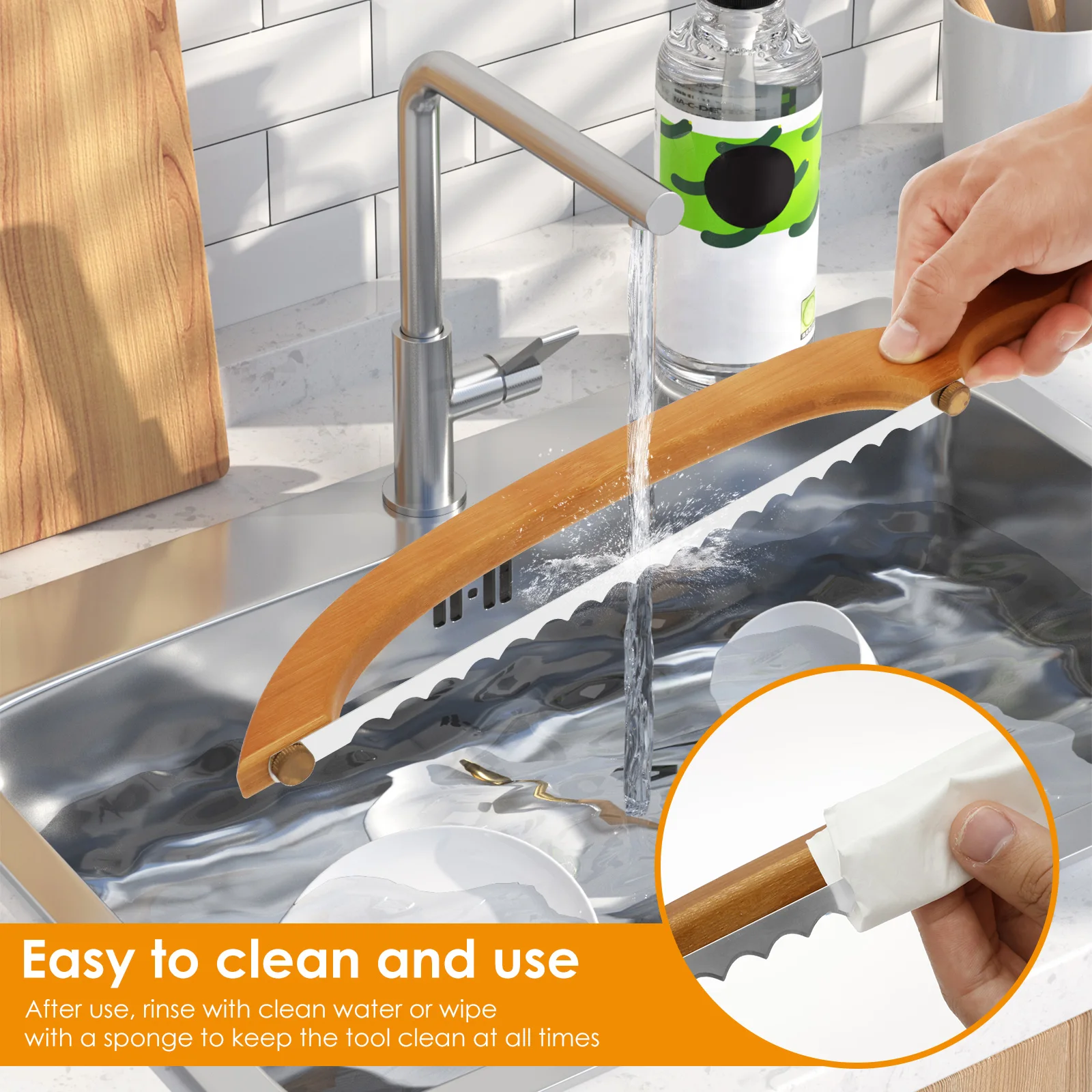 Bamboo Handle and Stainless Steel Blade : The handle is crafted from bamboo , boasting an attractive grain and sturdy texture that feels comfortable even during extended use . The blade installs without a screwdriver , simply tighten the screw for easy setup . The bamboo handle paired with a stainless steel saw blade ensures smooth , effortless bread slicing.